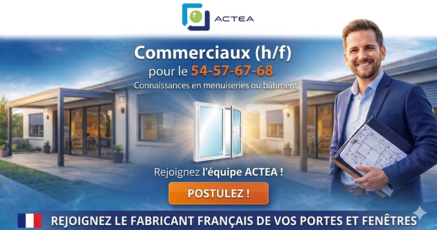 ACTEA est 'LE' fabricant/poseur de vos menuiseries sur le Grand Est (Alsace et Lorraine). Fenêtres, portes-fenêtres, volets, portes d'entrée, portes blindées ou encore portes de garage, venez découvrir tous nos modèles en PVC, Alu, ou Bois. Nous proposons également à nos clients des solutions domotiques et des alarmes. Avec 5 agences à proximité de Metz, Nancy, Strasbourg et Mulhouse, ACTEA vous accompagne et vous conseille dans TOUS vos projets de rénovation ou de construction neuve.